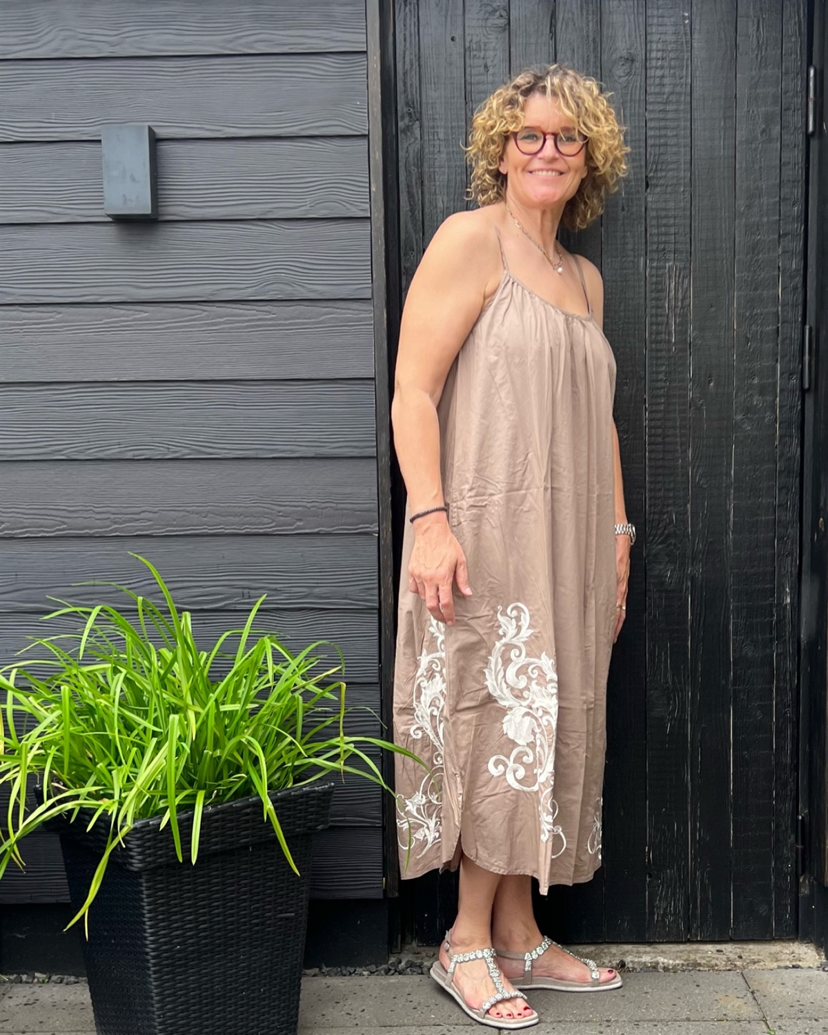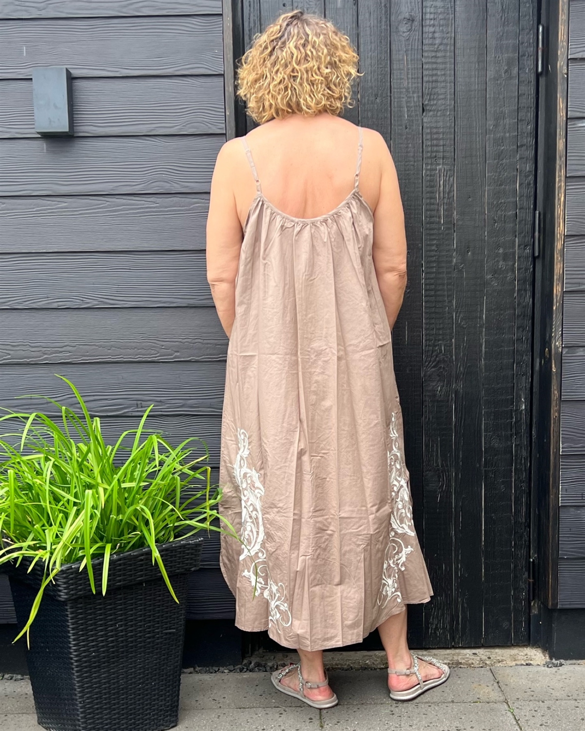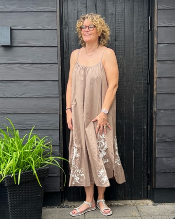 Skøn feminin singlet kjole fra GOSSIA i en blød og lækker bomulds kvalitet, med de smukkeste broderier på for og bagstykke. Noa kjolen er løstsiddende rynket smalt bånd i hals og ærmegab. Kjolen har justerbare stropper og lommer i sidesømmen.
