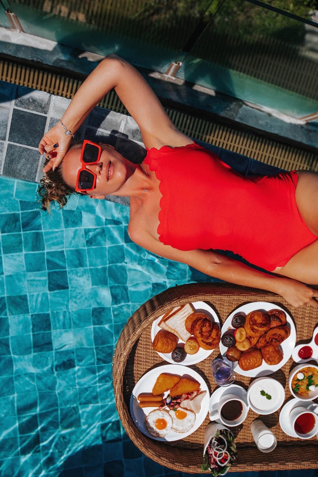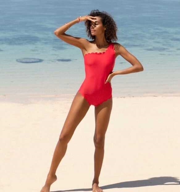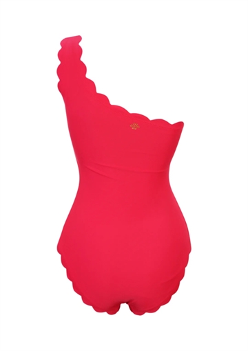 Smuk rød badedragt fra KAANDA Beach life. Badedragten har en bølget udtryk i kanterne og har tyndt indlæg ved brystet, som giver støtte.