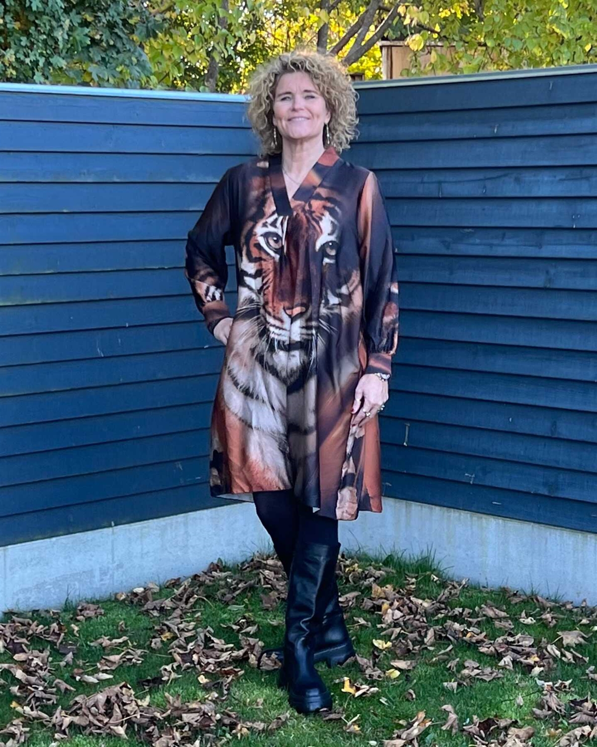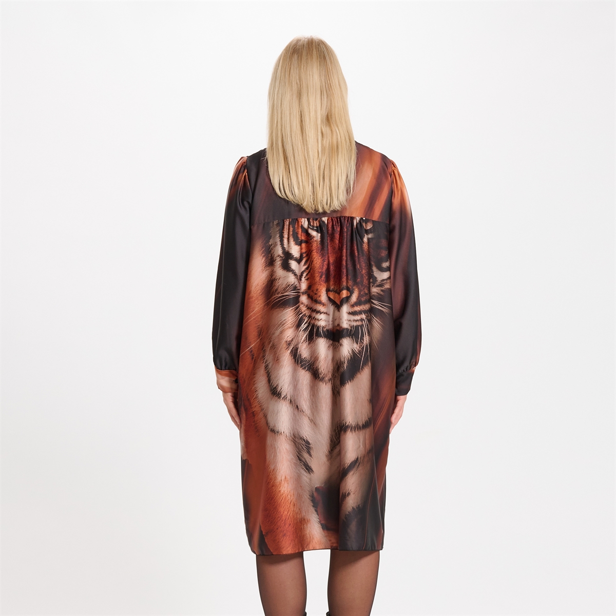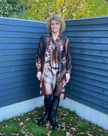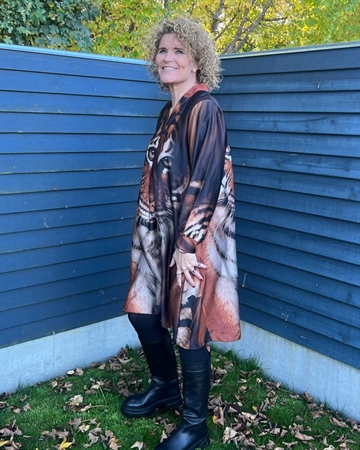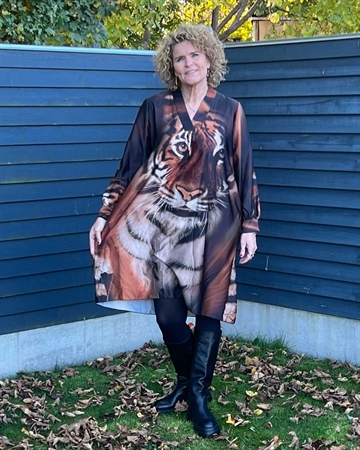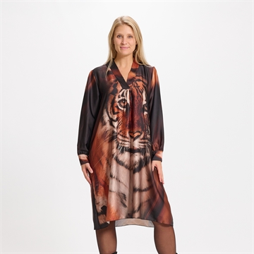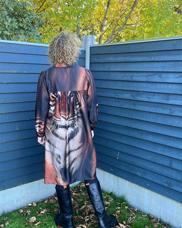 Er du typen der godt kan lide at skille sig lidt ud, så er dette lige kjolen for dig - den er gode smuk og noget helt specielt. Den har en v-udskæring og ærmerne slutter med en manchet. Kjolen har en løs pasform.
