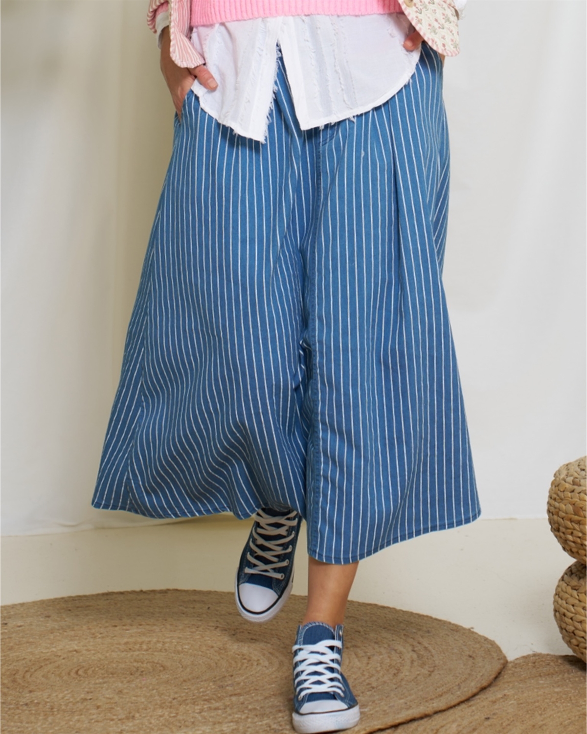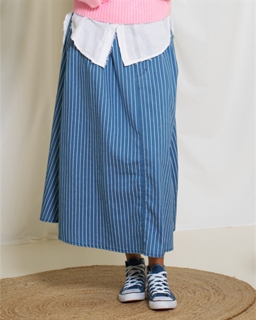 Skøn stribet nederdel fra Marta du Chateau, perfekt til både hverdag og mere afslappede anledninger. Nederdelen har en smuk pasform med en fast linning foran og elastik bagtil, der sikrer en behagelig og fleksibel pasform. De praktiske sidelommer tilføjer et afslappet touch, mens det klassiske design gør den let at style med både en enkel t-shirt eller en let skjorte. En must-have til din garderobe!