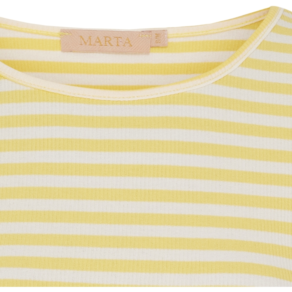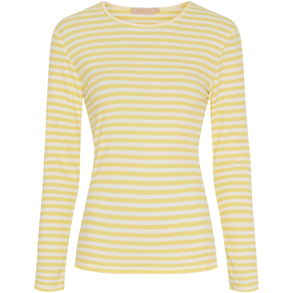 Lys dit outfit op med denne skønne stribede tee fra Marta Du Chateau! Den friske gule farve kombineret med klassiske hvide striber skaber et let og stilrent udtryk, perfekt til både forår og sommer. Den smigrende pasform giver et feminint touch, mens de lange ærmer gør den ideel til lag-på-lag styling.