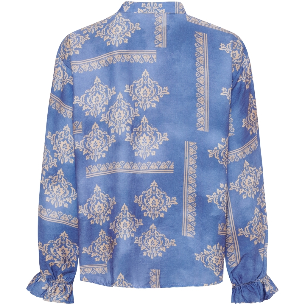 Elegant skjorte i en smuk jeansblå nuance med eksklusive orientalske mønstre, der giver et sofistikeret og luksuriøst udtryk. De fine flæsedetaljer ved V-udskæringen tilfører et feminint touch, mens de små knapper skaber et klassisk look.