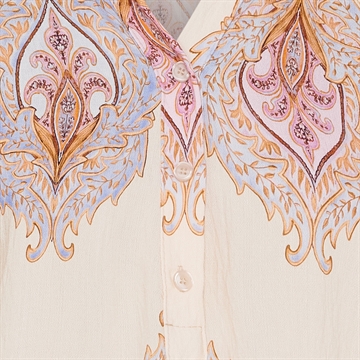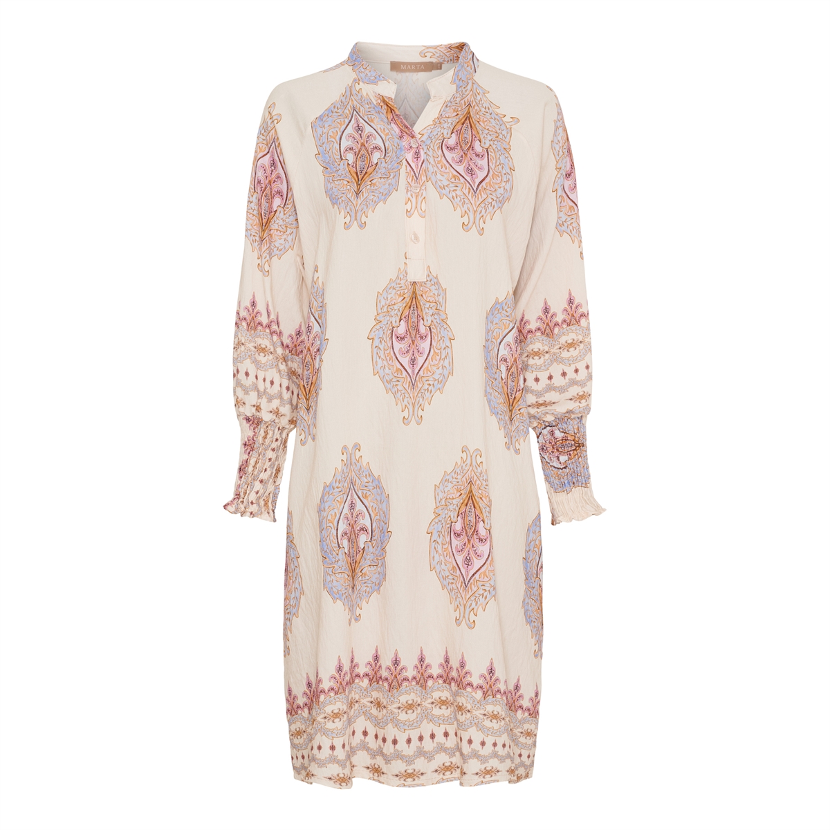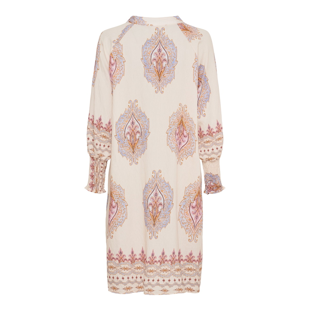 En elegant og feminin kjole med et smukt paisley-mønster i bløde farver. Eva Dress har en løs og let pasform, der falder smukt på kroppen og giver en afslappet, men stilfuld silhuet. De lange ærmer med elastik ved håndleddet tilføjer et raffineret touch, mens den delikate V-udskæring med bindebånd giver mulighed for at style kjolen efter eget ønske. Perfekt til både hverdag og festlige anledninger – style den med sandaler for et boheme-look eller med støvler for et mere råt udtryk. En tidløs favorit til garderoben!