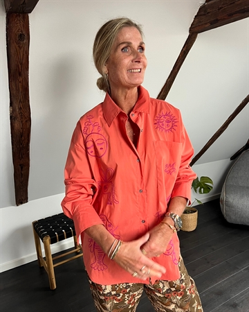 Smart skjorte fra MW. Skjorten her fåes i flere farver Skjorten er en oversized model, med meget flotte broderinger både foran og bagpå. Skjorten har 1 brystlomme og knaplukning foran.