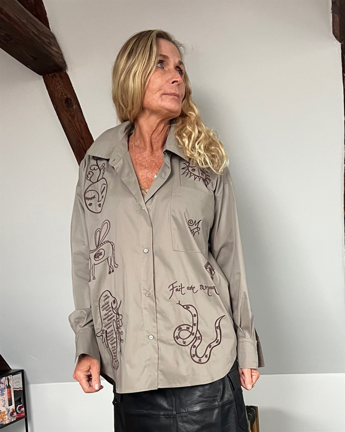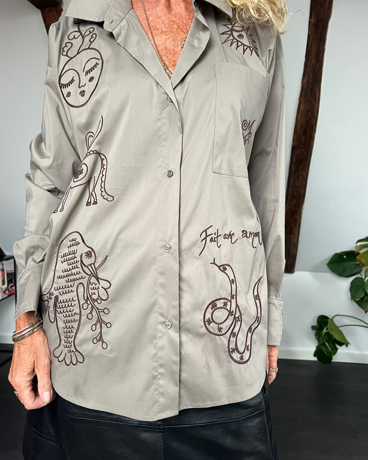 Smart skjorte fra MW. Skjorten her fåes i flere farver Skjorten er en oversized model, med meget flotte broderinger både foran og bagpå. Skjorten har 1 brystlomme og knaplukning foran.