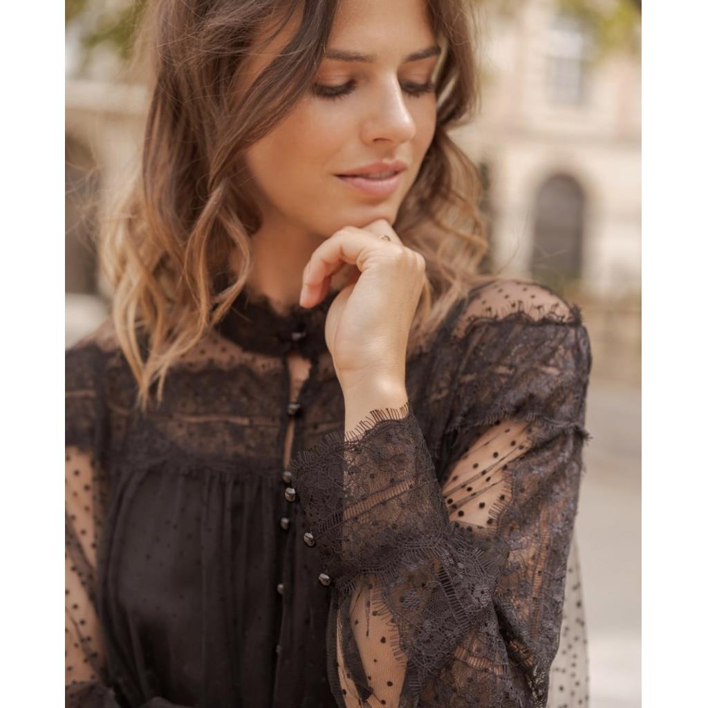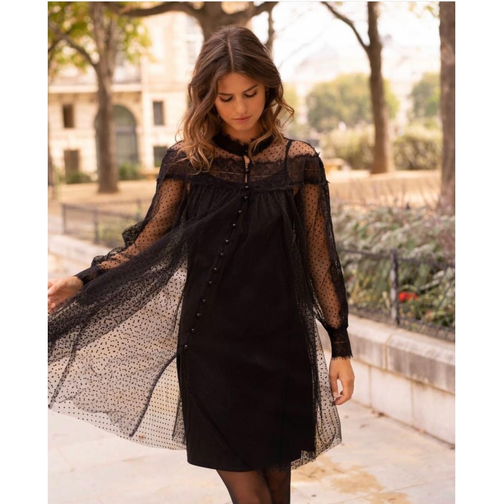 Smuk kjole fra Qunz i sort. Kjolen er i tyl og har i to lag blonder og er gennemkrappe foran og er i 2 lag så den ikke er gennemsigtig. Der er krave ved halsen.