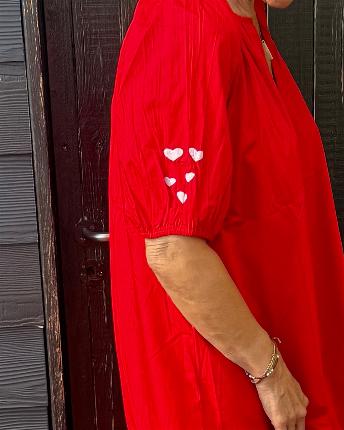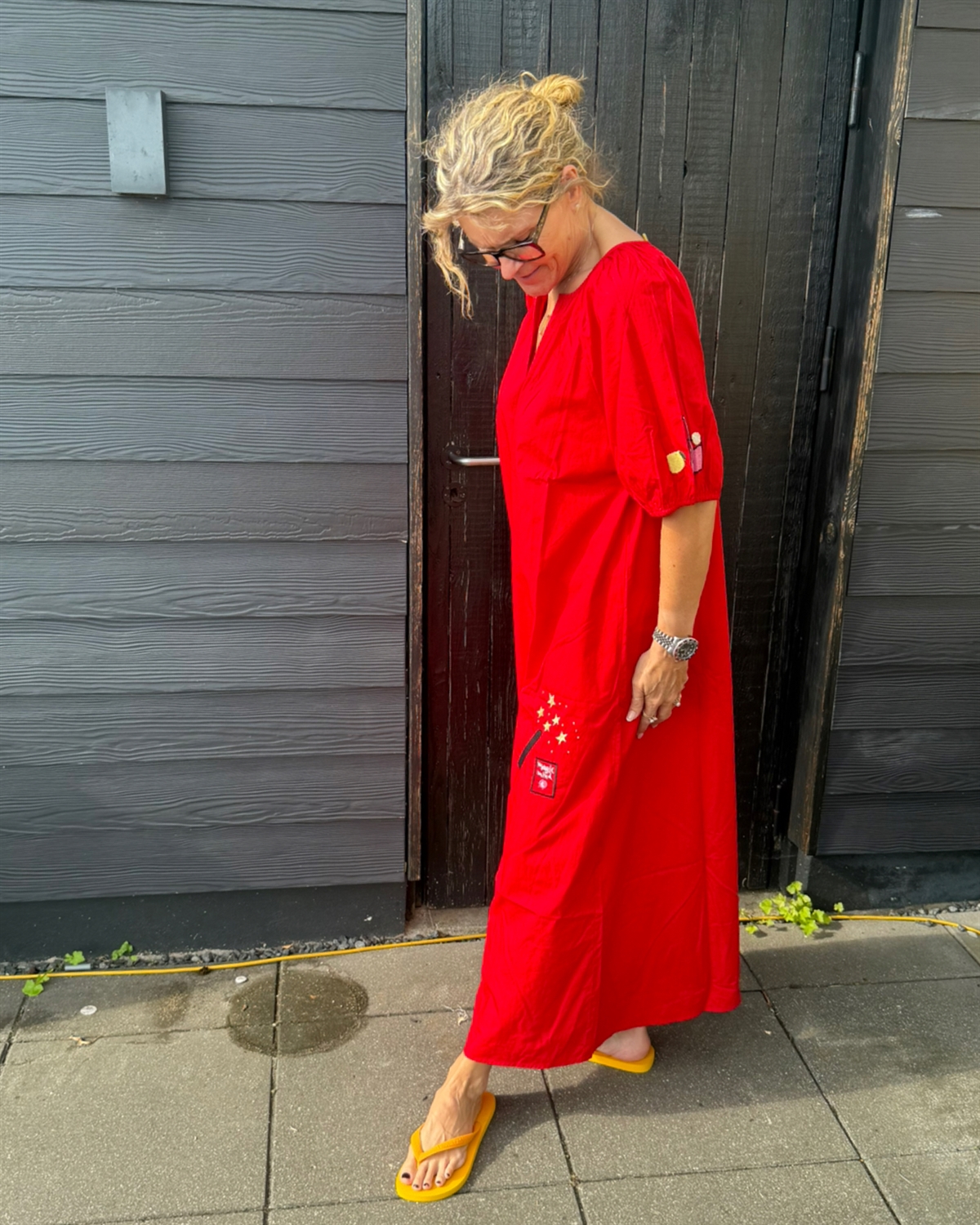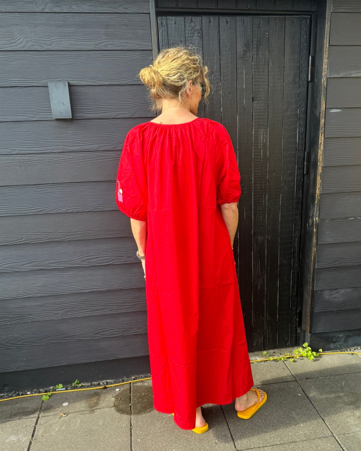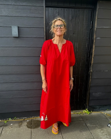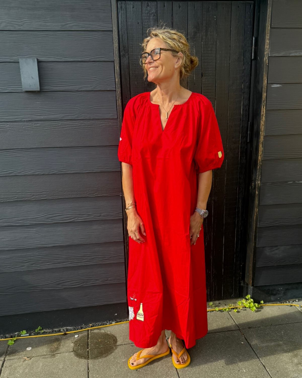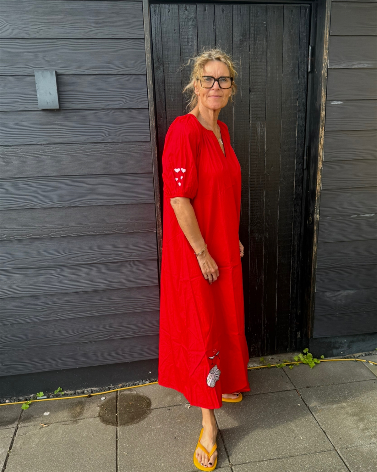 De fine broderede detaljer tilfører et unikt twist, mens den bløde v-hals og 3/4 længe ærmer med elastik giver kjolen et afslappet, men sofistikeret look. Perfekt til både stranden, sommeren og efterårets fester eller en afslappet dag i byen. Style den med sandaler eller en lækker støvle.
