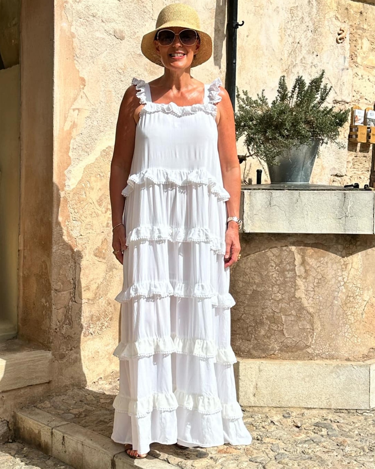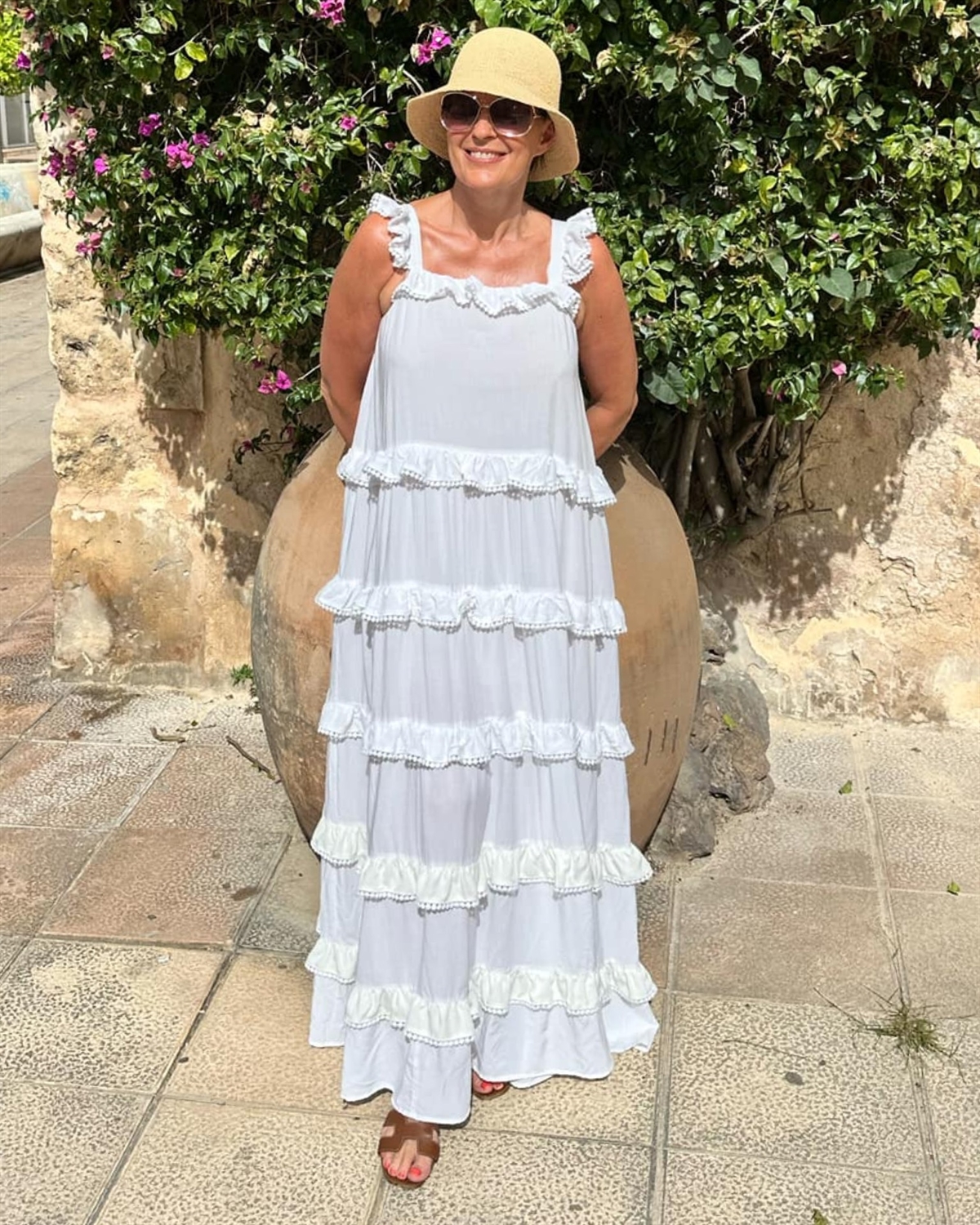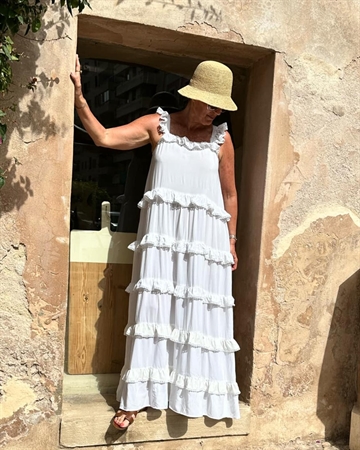 Den lette og luftige silhuet falder smukt om kroppen, mens de feminine flæsedetaljer skaber et eksklusivt og unikt udtryk. De brede stropper og en flatterende pasform gør den ideel til både hverdag og særlige anledninger.